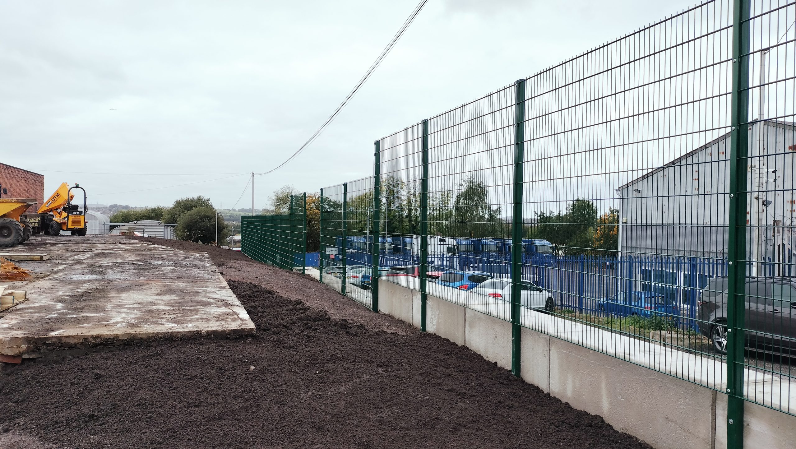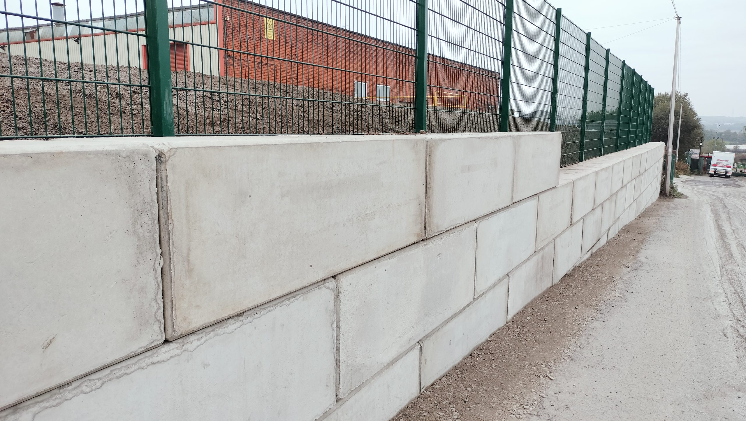 Description: An unstable boundary wall led to some urgent works at this industrial engineering site. DTM Groundworks Ltd were employed to first of all carefully remove the 100 year old original engineering brick wall and make the site safe. A new concrete foundation was then installed below the existing road level. DTM Groundworks Ltd then constructed a new interlocking concrete ‘Lego’ block retaining wall. Once installed the wall was backfilled, landscaping works carried out and a new powder coated 868 twin-wire mesh fence was installed to the top of the wall to secure the site. The work was completed within a few weeks with the site remaining open and secure throughout the works. Photos can be seen to the right.